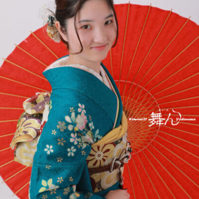 ルクールは「絆」 大切なひとと迎える成人の記念日 それは心の絆の日 舞んは振袖美人を応援します 深いターコイズブルーに、柔らかな色合いの草花が映える、上品で華やかな一着です。 凛とした表情に、赤い和傘が彩りを添えて、最高