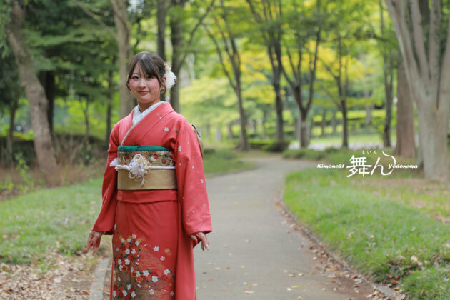 緑が美しい公園のロケーションに、鮮やかな朱色のお振袖がとってもよくお似合いでした。