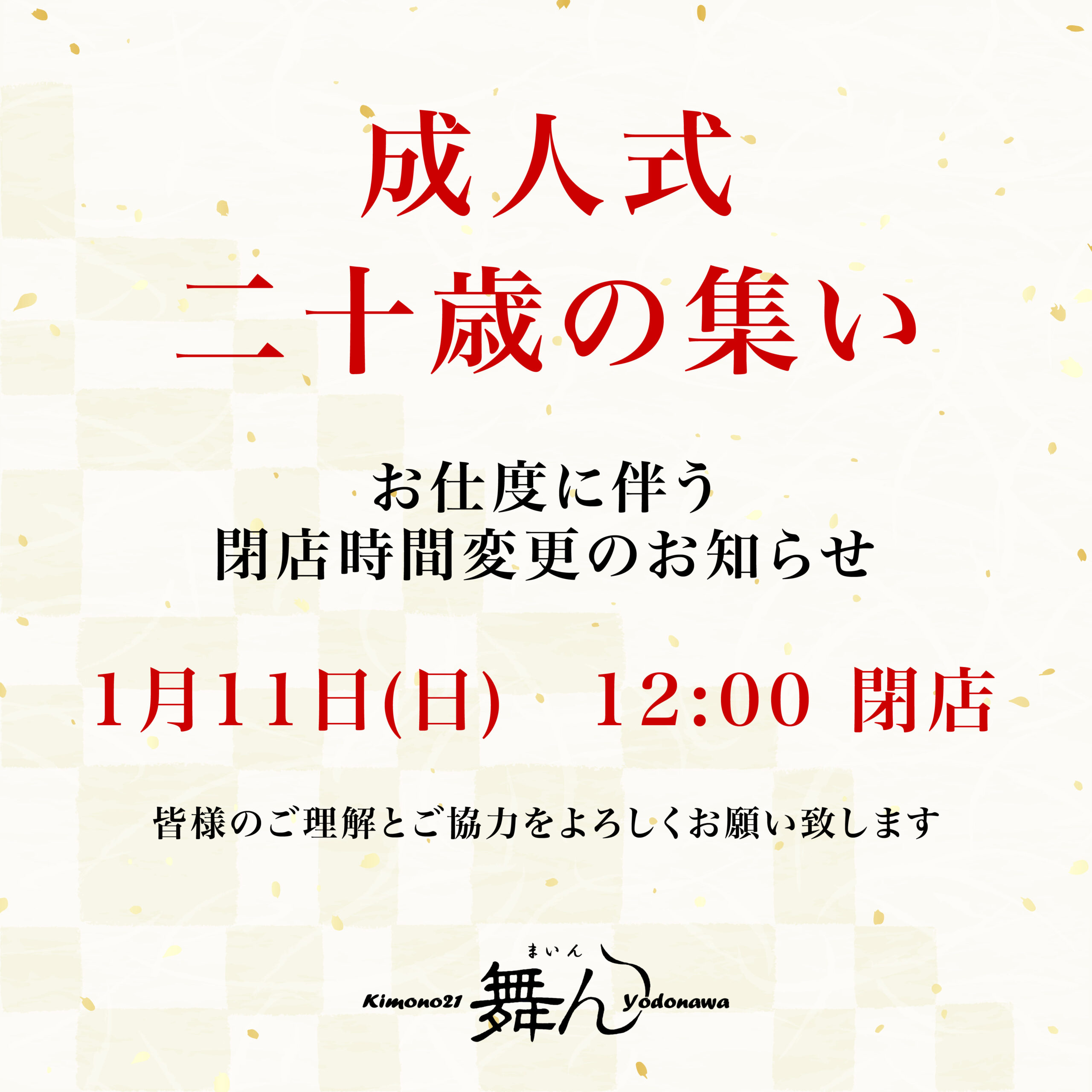 1月11日(日)は成人式「二十歳の集い」に出席される皆様のお仕度のため午後12時閉店とさせていただきます。