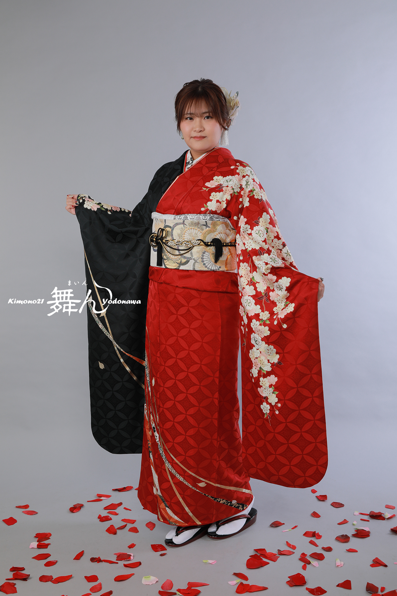 赤と黒のコントラストが美しい、モダンで格調高い振袖姿。