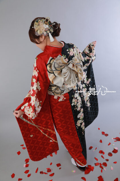 自分らしくドレスアップして心に残る想い出を… しあわせがあふれるルクールの振袖で 舞んは振袖美人を応援します 成人式の前撮り撮影をさせていただいた素敵なお客様をご紹介します✨ 鮮やかな赤地に、落ち着いた黒のぼかしが入った