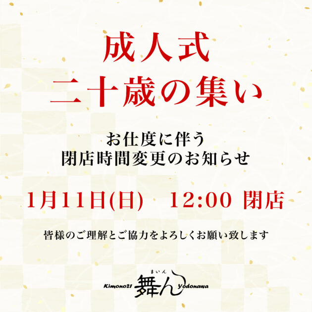 1月11日(日)は成人式「二十歳の集い」に出席される皆様のお仕度のため午後12時閉店とさせていただきます。 皆様のご理解とご協力をよろしくお願いいたします。 12日(月)は通常通り営業いたします。 #成人式 #二十歳の集